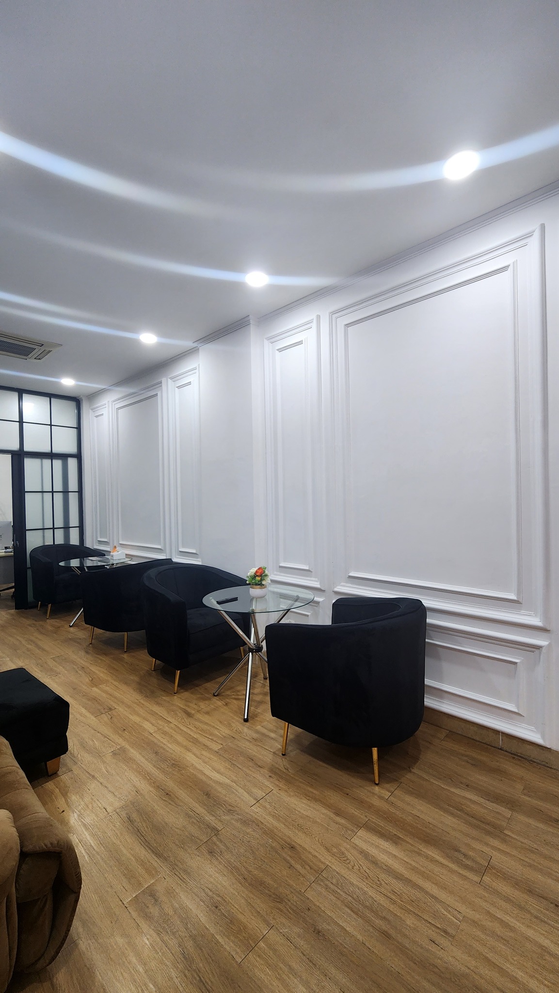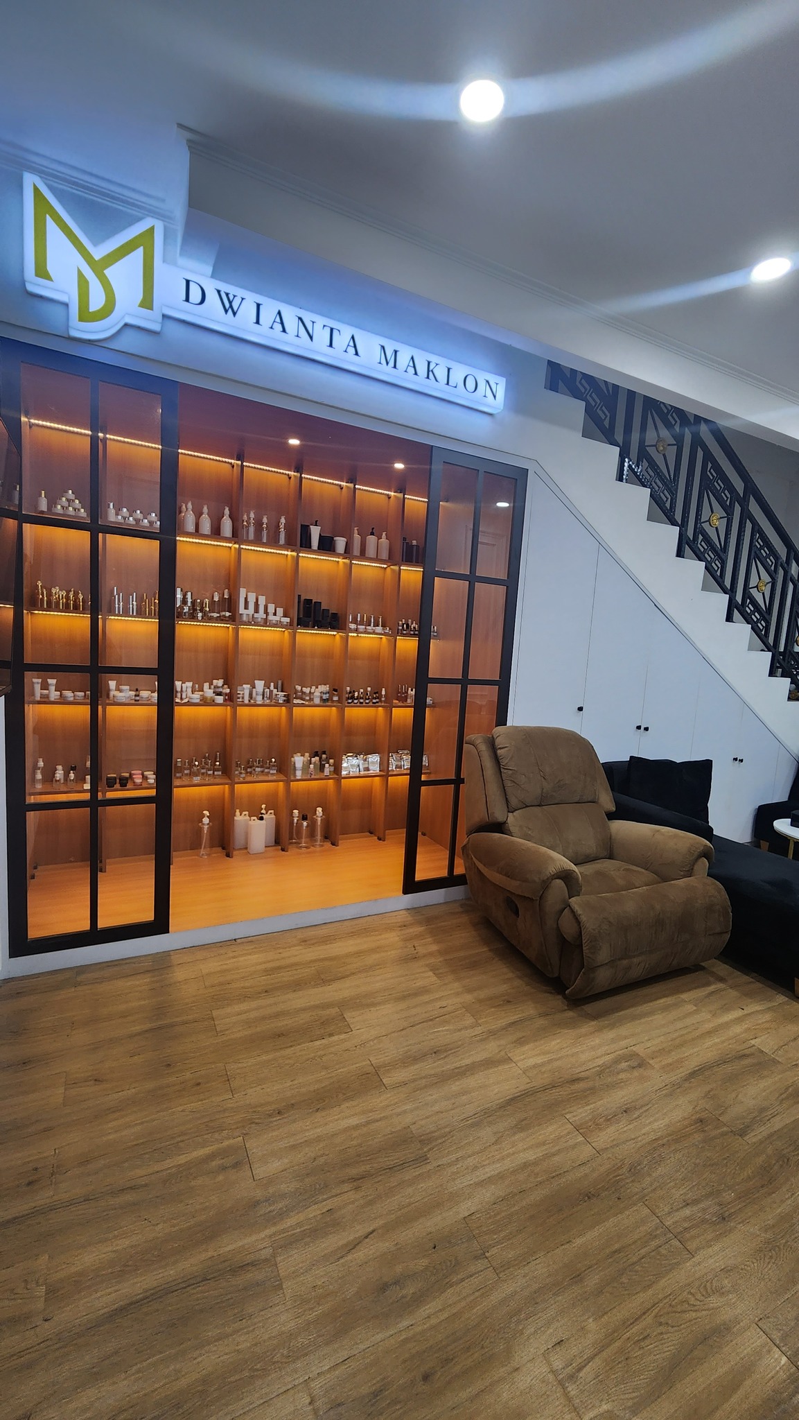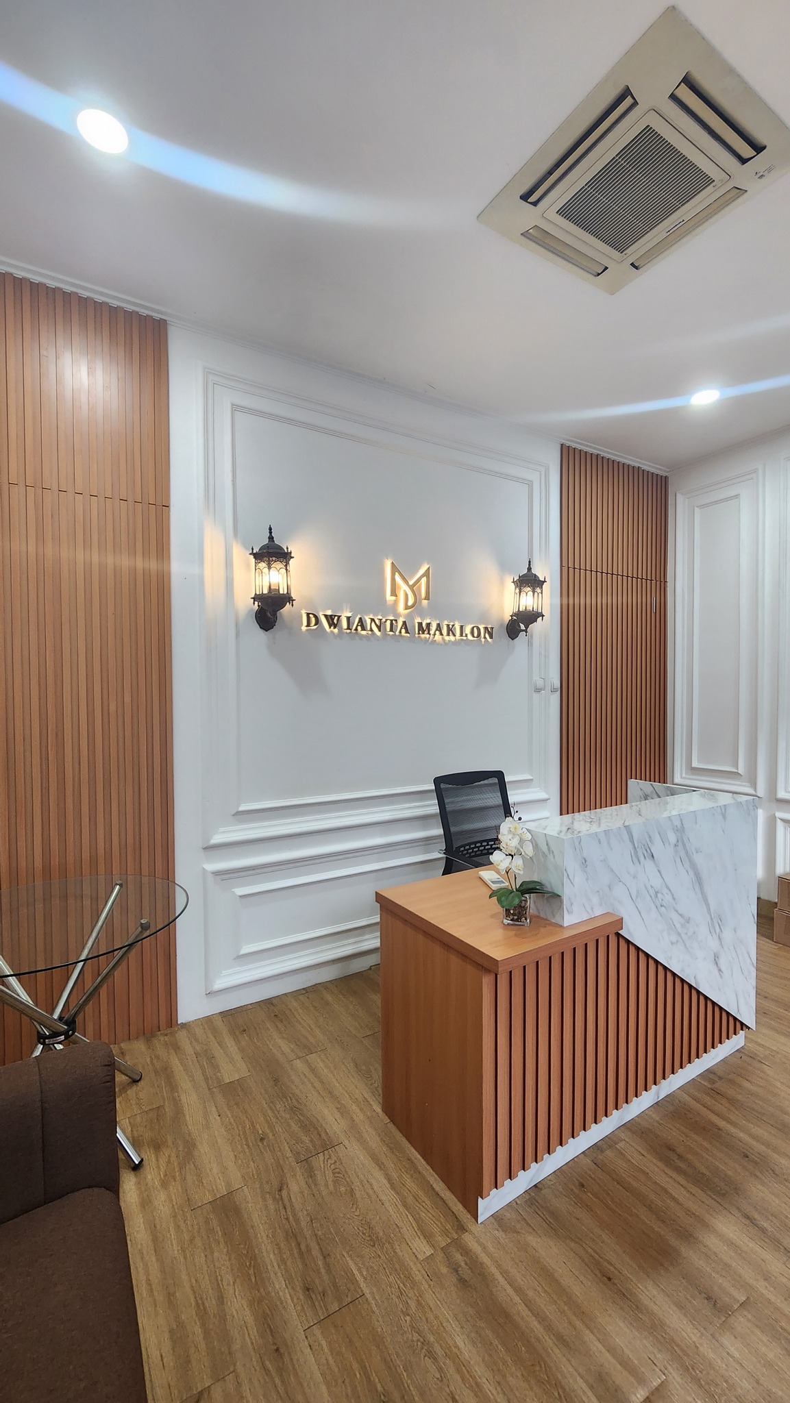 - Dinding Aksen: Dinding backdrop logo kami beri sentuhan klasik modern dengan moulding putih bersih, menciptakan kanvas yang elegan. Logo “DM Dwianta Maklon” dari material gold dengan backlight hangat langsung menjadi pusat perhatian.