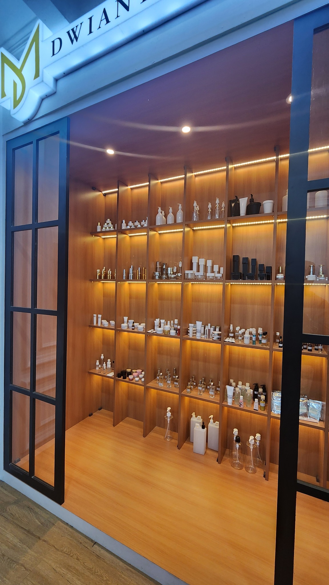 Kami merancang sebuah etalase custom yang megah dari lantai ke langit-langit, dengan frame hitam industrial yang kontras elegan dengan interior rak kayu. Setiap ambalan kami tanamkan pencahayaan LED strip hangat, membuat setiap kemasan produk skincare di dalamnya bersinar dan terlihat eksklusif. Ini bukan sekadar rak pajangan; ini adalah panggung bagi karya mereka.